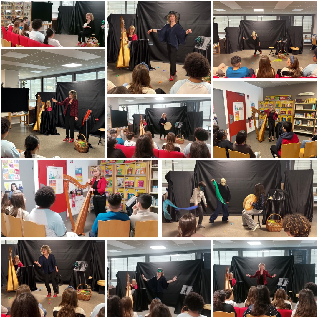 Les élèves ont, tout d’abord, assisté à un spectacle de contes, mêlant narration orale et musique live. Ils ont, ainsi, été transportés dans des univers merveilleux où la voix de la conteuse, mêlée aux sonorités de la harpe, donne vie aux personnages et aux paysages imaginaires.